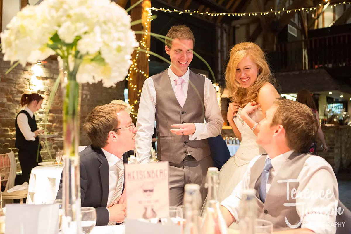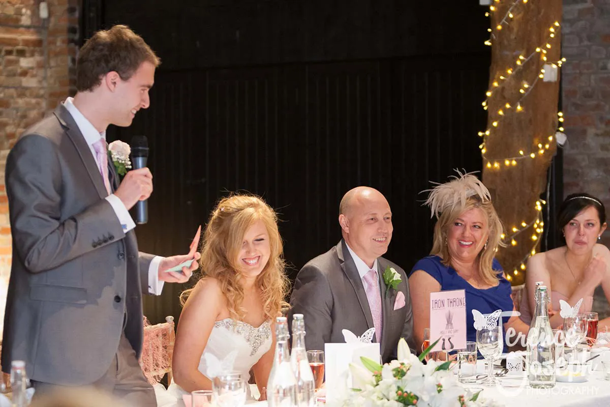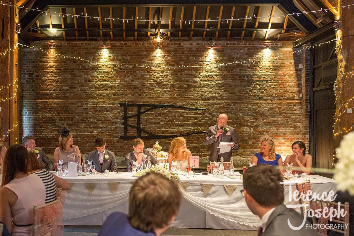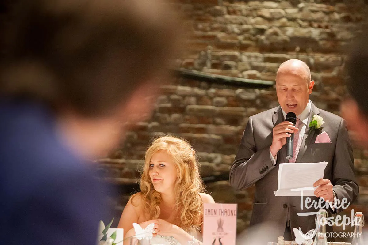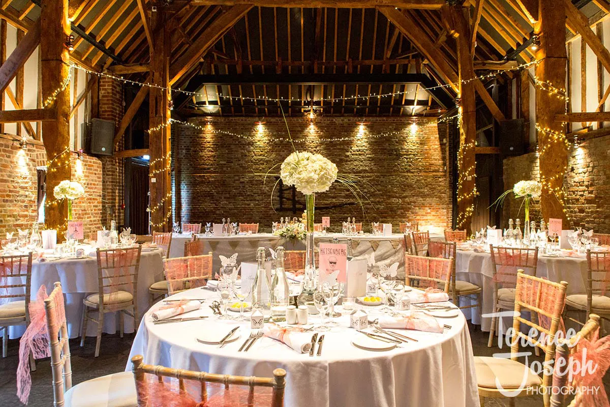 After the ceremony and the group photos in the walled garden, we made some time for their wedding portraits. Making full use of the old wagon surrounded by the petals from a pink Blossom tree. The castle turrets were the next backdrop. Then onto a gorgeous idyllic sign post that has that perfect country feel. Holly and Gary were beaming, were so full of happiness, it was a joy to see. Check them out below, they are just so natural! Their wedding breakfast was held at the Tithe Barn with beautiful exposed high beams and natural brickwork. The fairy lights working in perfect unison with some light pink highlight decorations on the chairs and table.