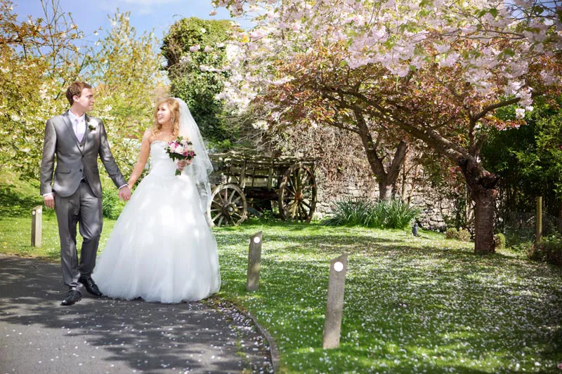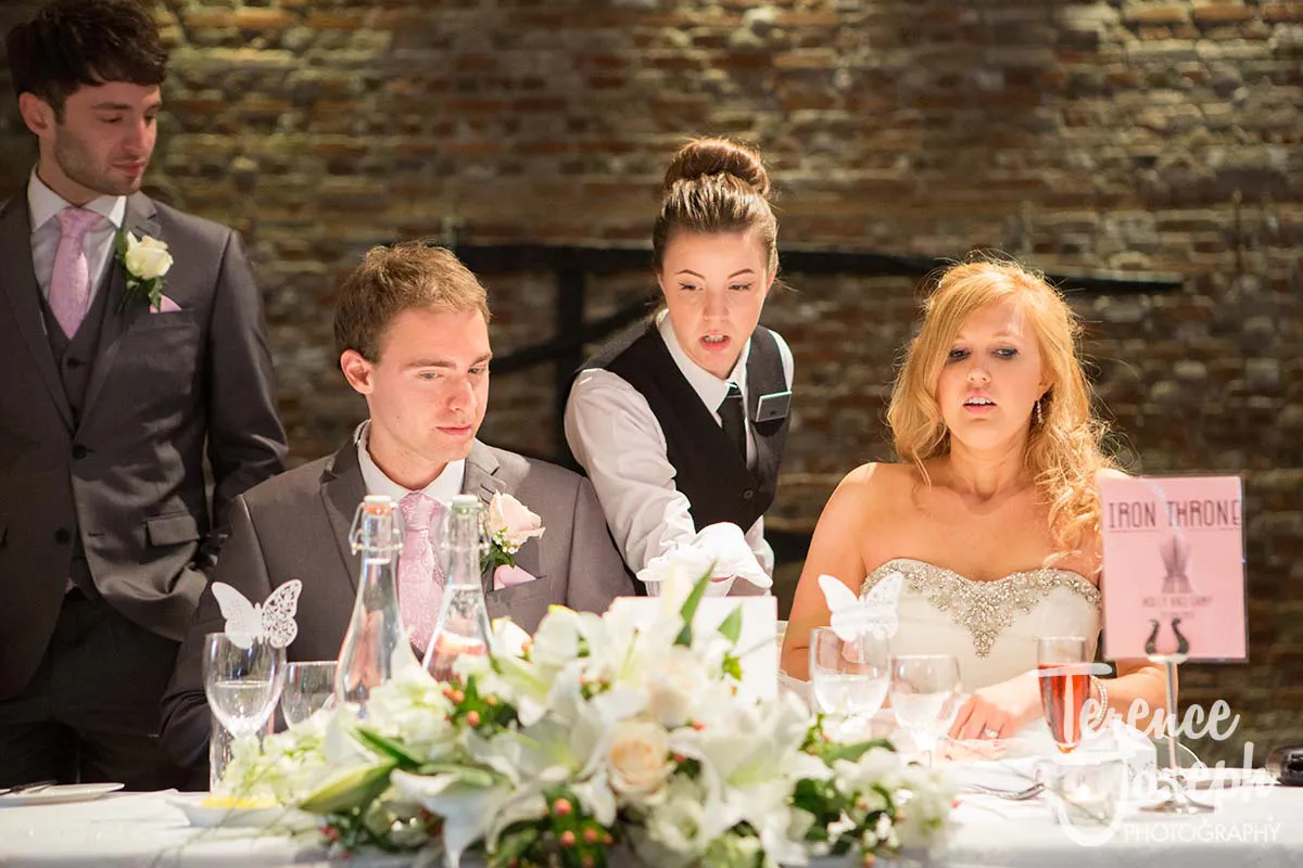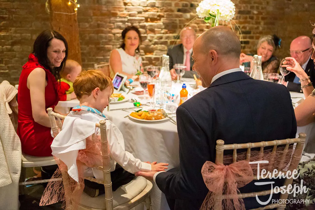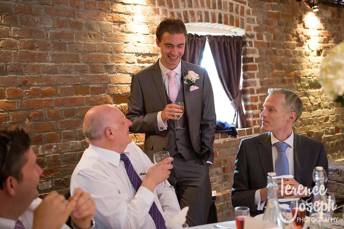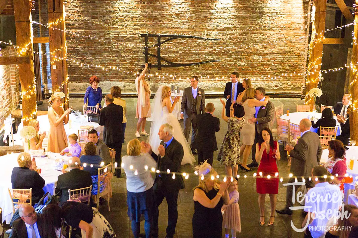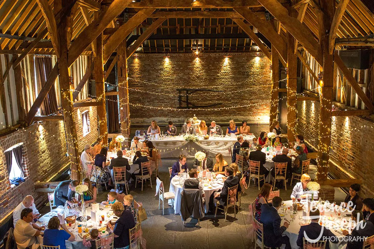 After the ceremony and the group photos in the walled garden, we made some time for their wedding portraits. Making full use of the old wagon surrounded by the petals from a pink Blossom tree. The castle turrets were the next backdrop. Then onto a gorgeous idyllic sign post that has that perfect country feel. Holly and Gary were beaming, were so full of happiness, it was a joy to see. Check them out below, they are just so natural! Their wedding breakfast was held at the Tithe Barn with beautiful exposed high beams and natural brickwork. The fairy lights working in perfect unison with some light pink highlight decorations on the chairs and table.