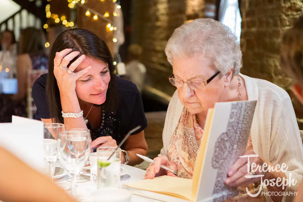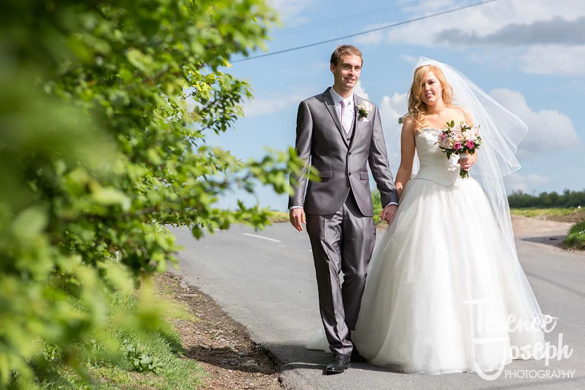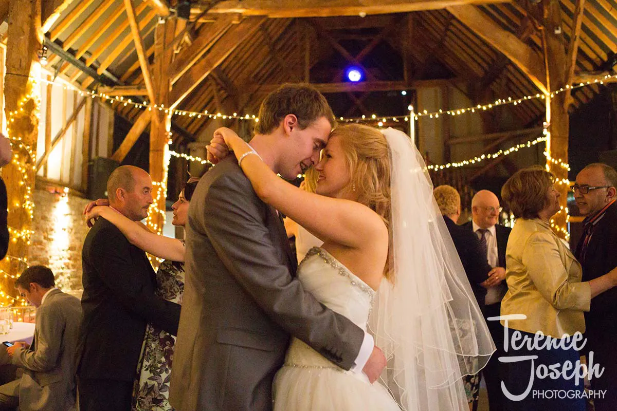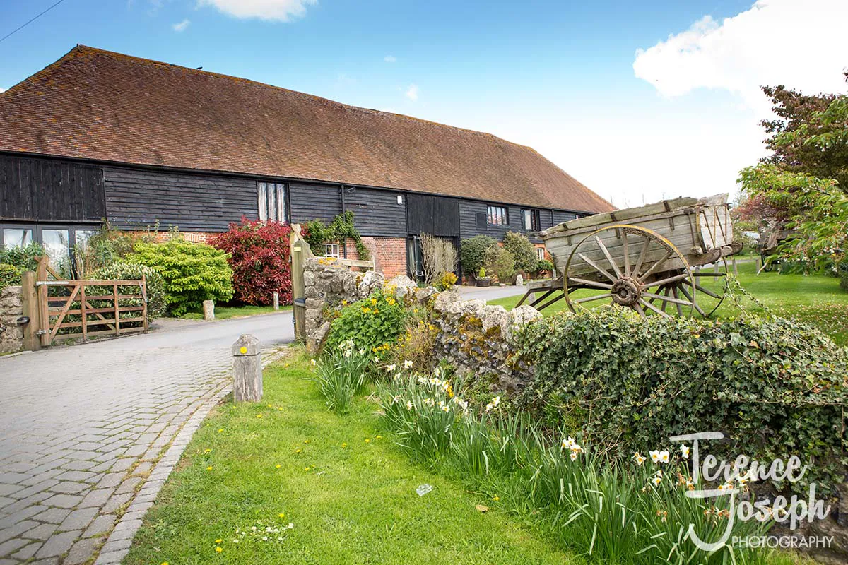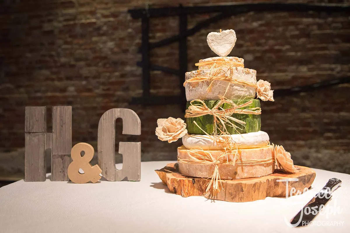 After the ceremony and the group photos in the walled garden, we made some time for their wedding portraits. Making full use of the old wagon surrounded by the petals from a pink Blossom tree. The castle turrets were the next backdrop. Then onto a gorgeous idyllic sign post that has that perfect country feel. Holly and Gary were beaming, were so full of happiness, it was a joy to see. Check them out below, they are just so natural! Their wedding breakfast was held at the Tithe Barn with beautiful exposed high beams and natural brickwork. The fairy lights working in perfect unison with some light pink highlight decorations on the chairs and table.