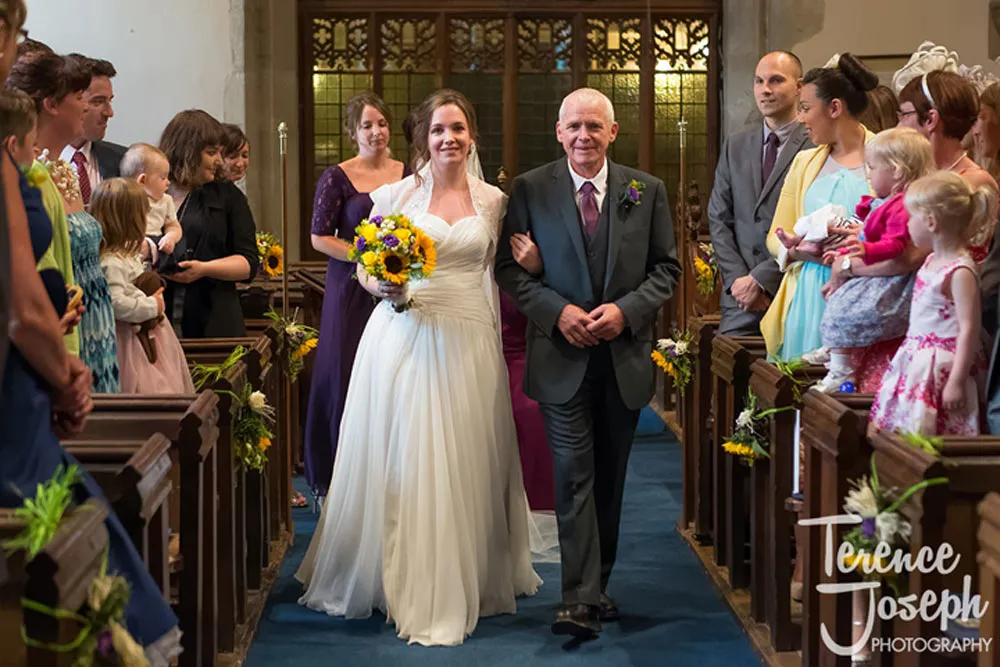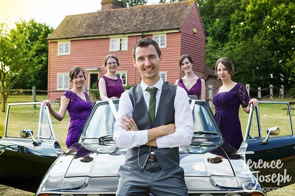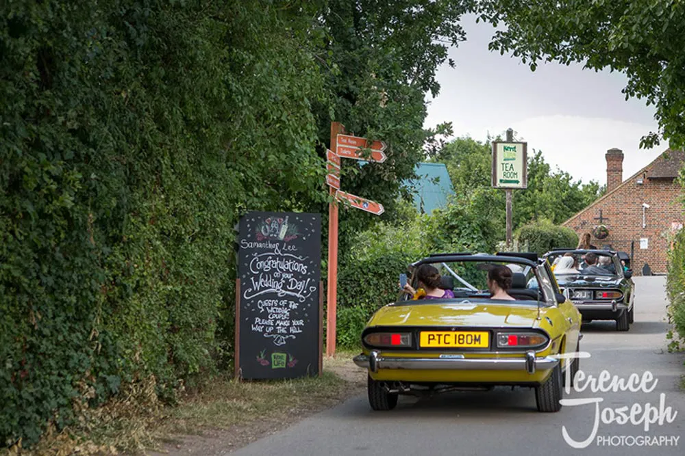 Sam arrived at St Margaret’s Church in Barming, Kent, in spectacular style. The wedding party made their entrance in a fleet of Triumph Stag convertibles driven by her father and his close-knit circle of friends. Affectionately known as “the gang.” This unique and personal touch set the tone for a day full of love, laughter, and meaningful connections.